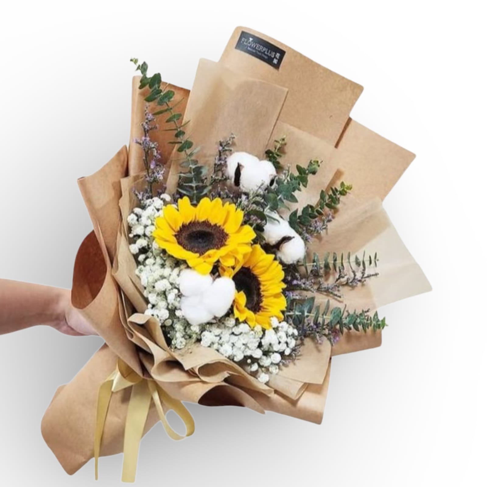 The arrangements consists of: 2 Sunflowers with white baby breaths, cotton flower, purple capsica, eucalyptus with Kraft Wrapping.