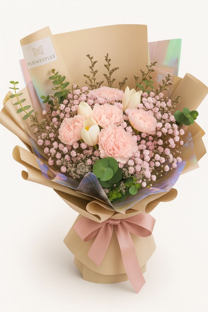 A charming blend of elegance and sweetness — this bouquet features delicate pink carnations paired with pure white tulips. The soft pink hues represent admiration and gratitude, while the white tulips symbolize purity and new beginnings.