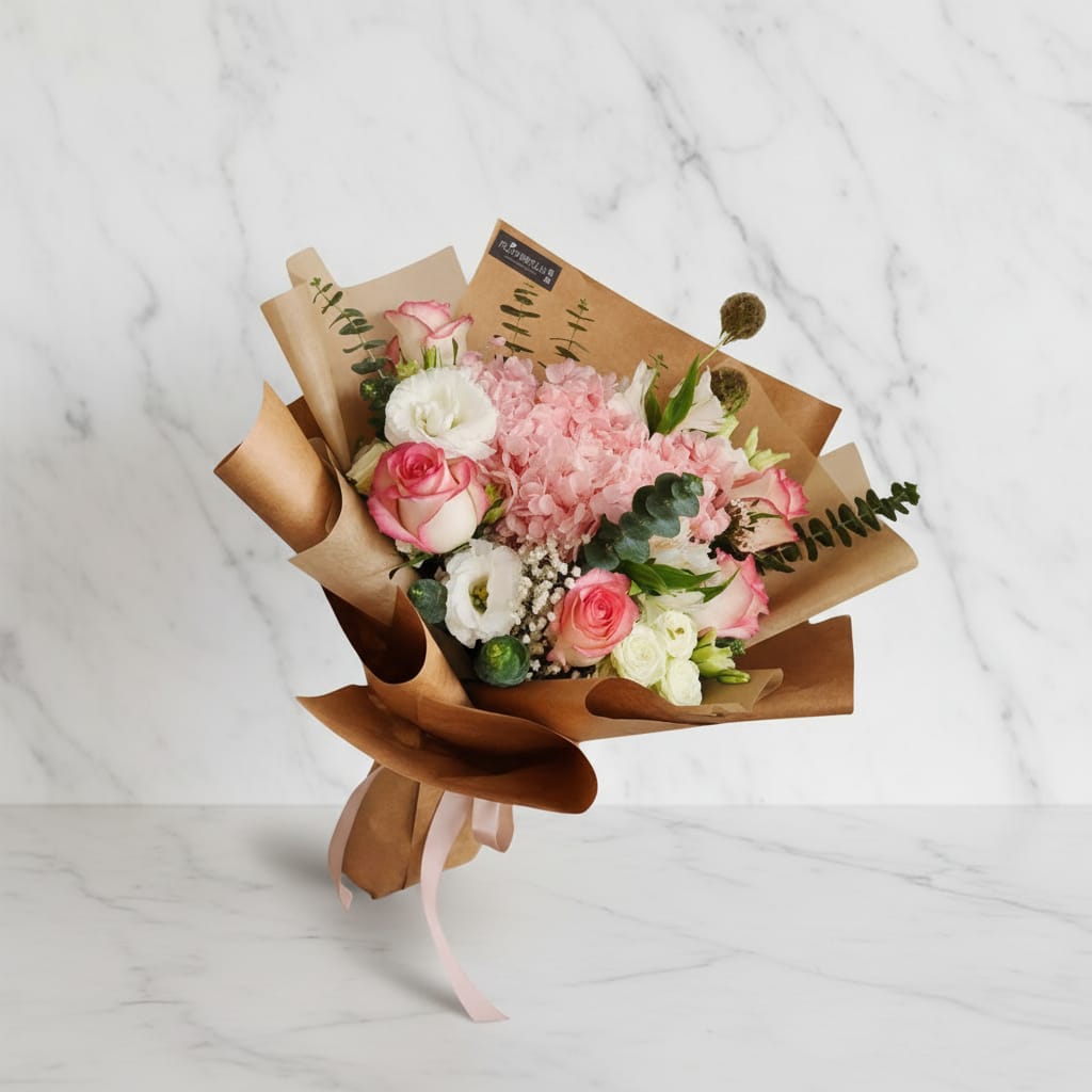 Embrace the perfect harmony of love and elegance with this delicate hand bouquet, thoughtfully crafted to convey your most heartfelt sentiments. Featuring 1 fresh pink hydrangea, white eustoma, and 5 blooms of two-tone roses, this arrangement is gracefully accented with astro white and eucalyptus baby blue.