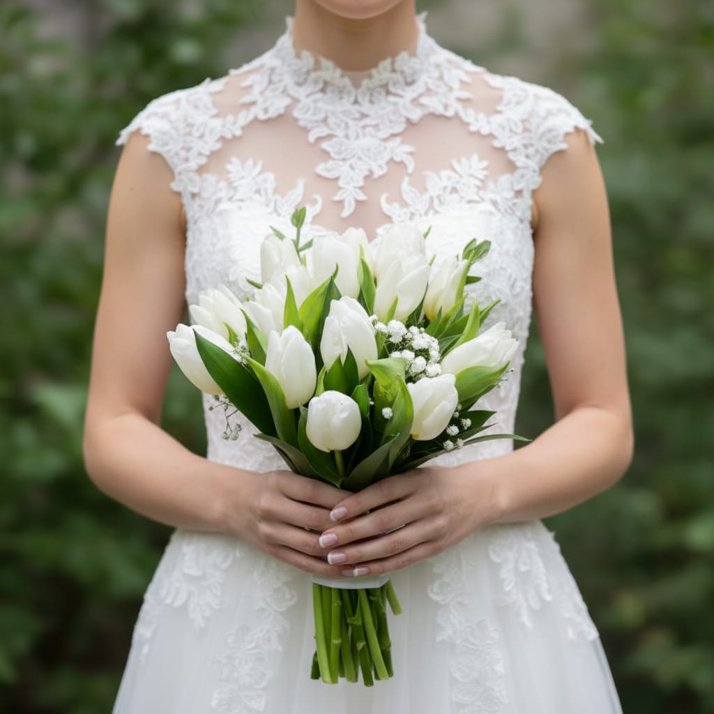An elegant arrangement featuring 20 pristine white tulips complemented by delicate white baby’s breath.