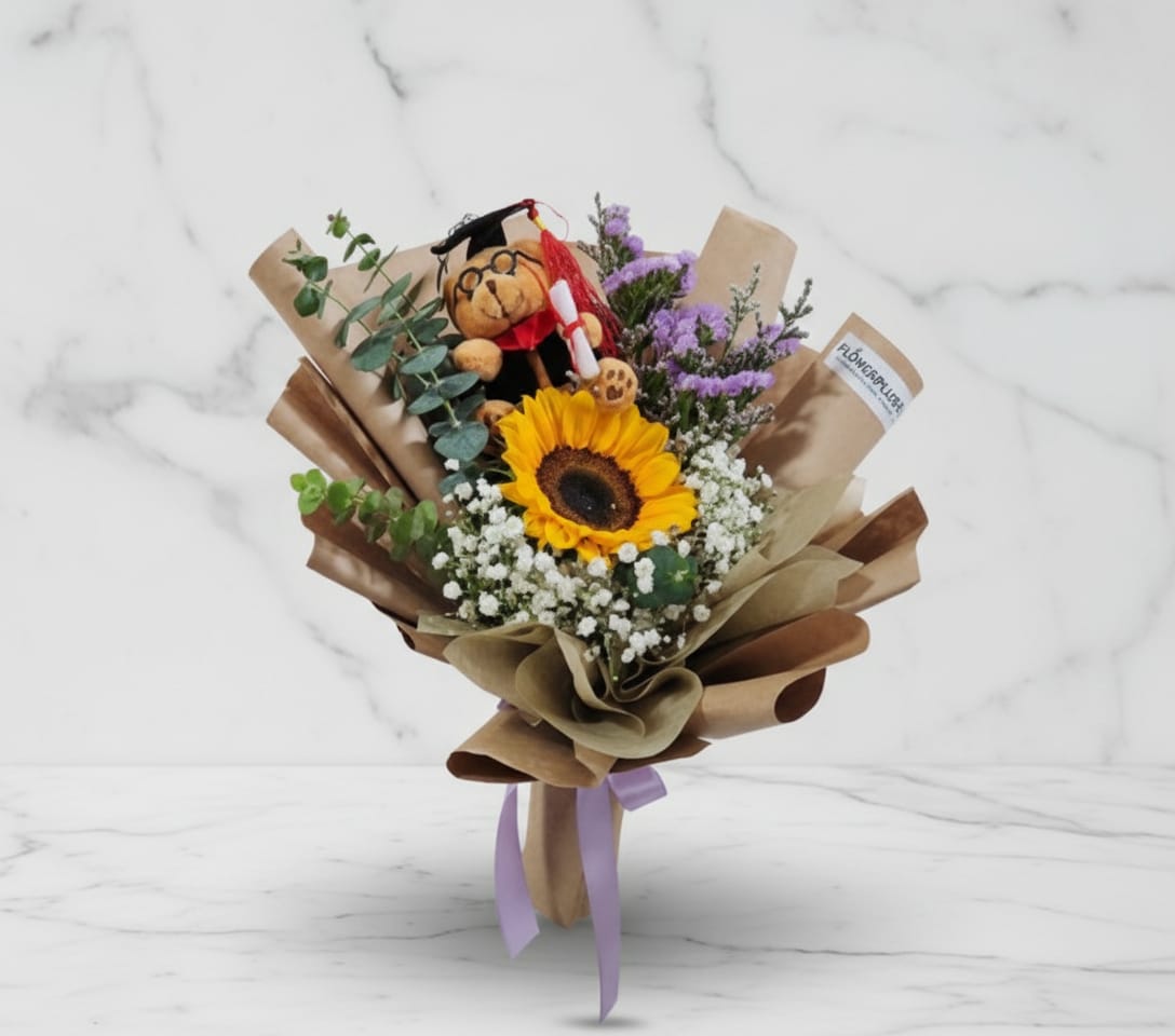 This arrangement consists of sunflower, white baby breath, purple caspia, lilac statice, accompanied by eucalyptus baby blue.