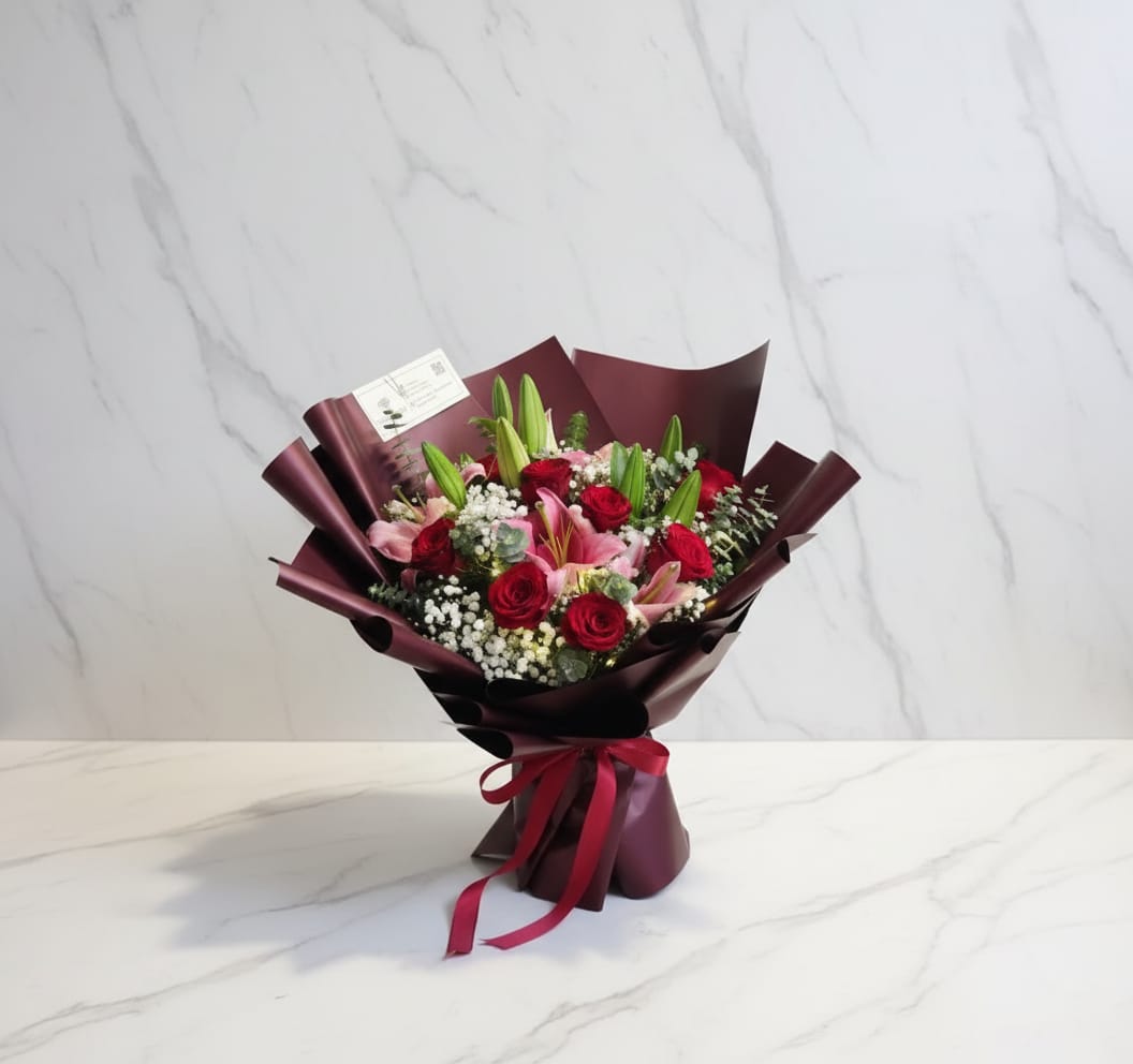 A graceful arrangement featuring pink lilies, fresh white baby’s breath, red roses, and lush green foliage.